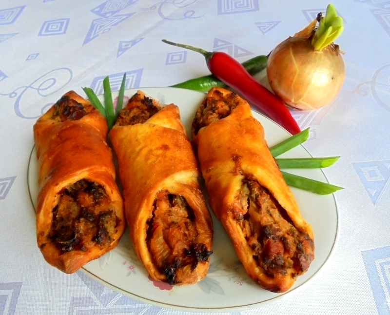 Z masła mąki jajka i wody szybko zagnieść ciasto zawinąć w folię odstawić do lodówki na 30 min. Paprykę cebulę i boczek pokroić w paski usmażyć na oleju doprawić. Farsz powinien być pikantny. Ciasto rozwałkować pokroić na kwadraty nałożyć farsz zlepić. Piec w nagrzanym piekarniku do 180 stopni 15-20 minut.