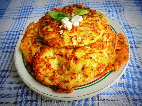 Powstałą wodę odlać. Fetę pokroić w kostkę dodać do cukinii , dodać jajka mąkę sól i pieprz dokładnie wymieszać.